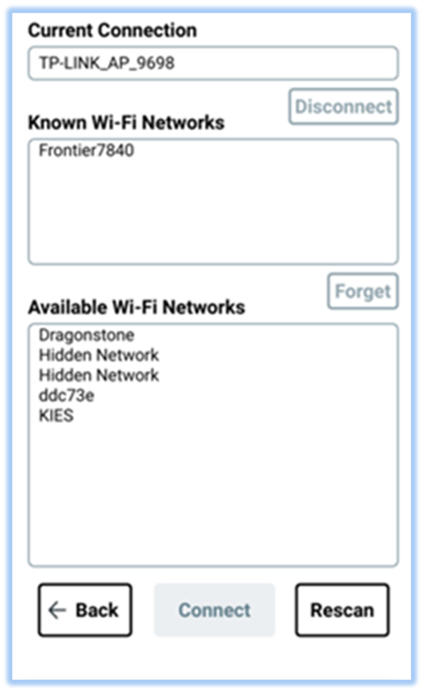 Wi-Fi Settings show the current, known, and available Wi-Fi networks
